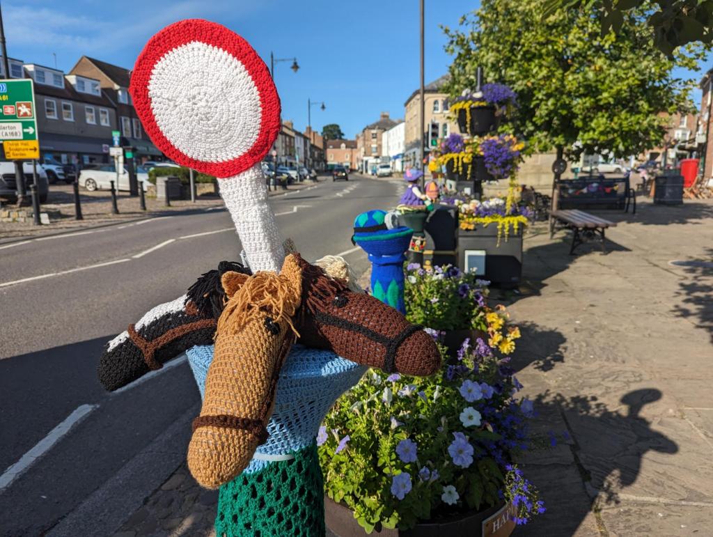 Meeting the Thirsk Yarnbombers behind the wonderful display in the marketplace themed around “A Day at the Races”.